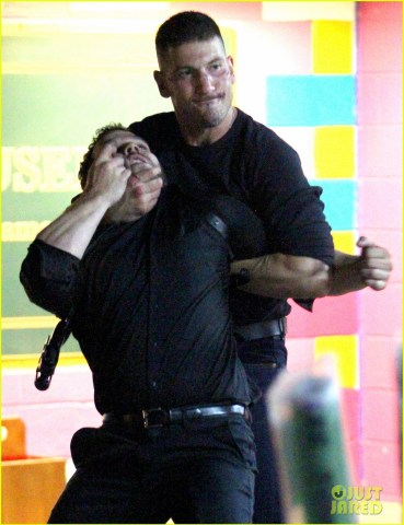 We’ve now got one of our first looks at Jon Bernthal as the Punisher in character filming a scene for this upcoming season of Daredevil. Bernthal was announced as the actor who would bring Frank Castle to life back in June, and it’s pretty exciting to see him all ready to go, looking all menacing and stuff on set. The set photos are of him disarming and beating up an unnamed character, the both of them replete with dark clothing because of course they both wear all black. This is gritty television, people.