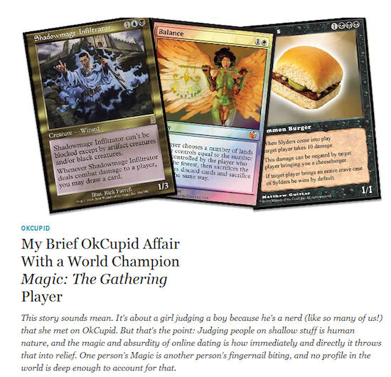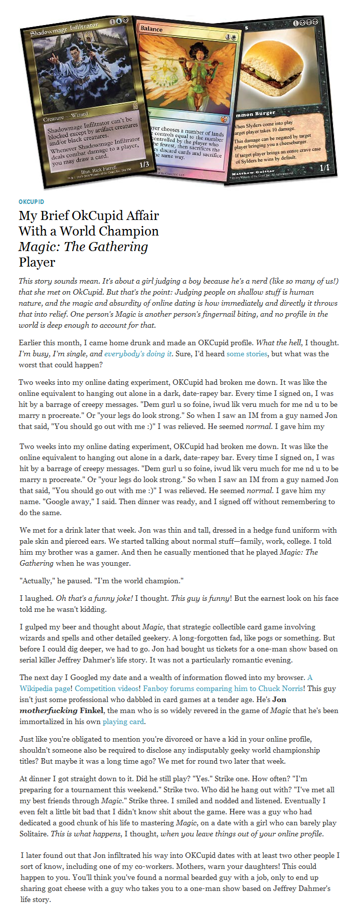 A little history here might be needed: At some point in the past, Alyssa Bereznak got drunk, made an OKCupid account and ended up going out on a date with Jon Finkel. These are the facts as they have been related to us. Apparently, not disclosing your status as a former world champion in a sport — ESPN covered it, therefore, sport — is grounds for disgruntlement.