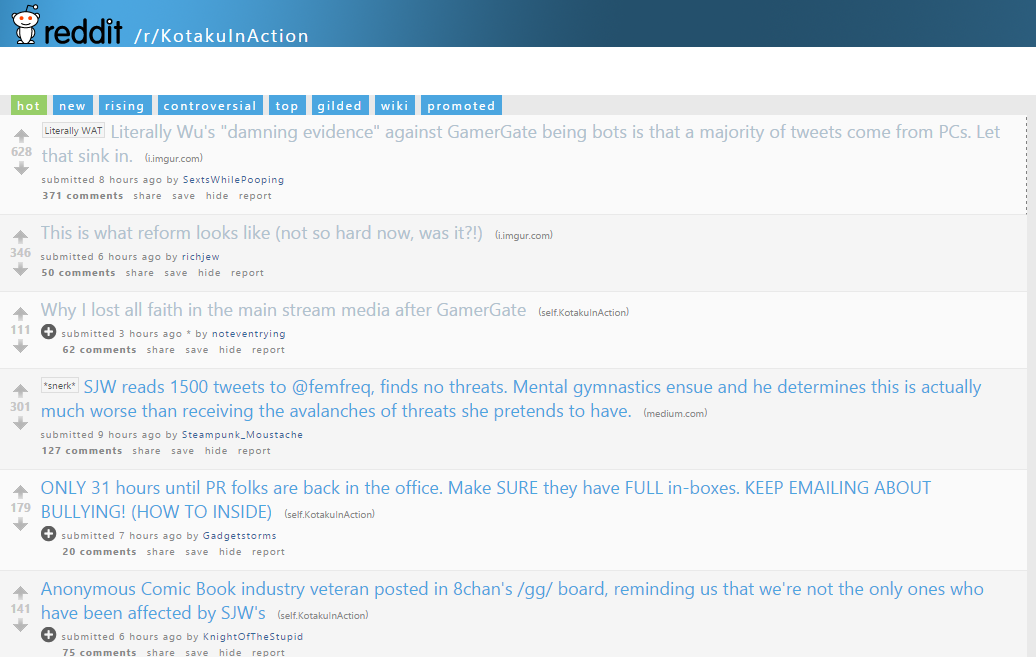 Uh huh. That’s why at this very moment three of the top six posts on KIA—the subreddit I was explicitly instructed to visit if I wanted to see the real GamerGate—are about Wu and Sarkeesian (oh, I’m sorry, LW1 and LW3 [or is Wu 2? I can’t keep track]) and social-justice warriors.
