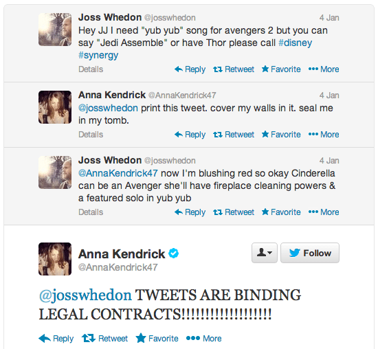 Of course Whedon is joking. But in this final tweet, at least, I think Anna Kendrick speaks for us all.