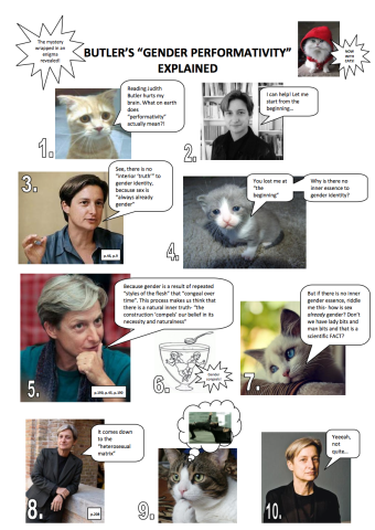 When I woke up this morning, I was largely ignorant of the work of American philosopher Judith Butler. I didn’t exactly lose a lot of sleep over this, but I wasn’t proud of it either, if only because I’m of a mind that one should never be proud of not knowing something. This morning, though, I was lucky enough to stumble on the infographic/educational cartoon that is Judith Butler Explained With Cats. Now, a half hour and most of a pot of french press later, I feel reasonably conversant regarding Dr. Butler’s work (I’m probably not). On a related note, I feel like way more things should be explained in the format of “Socratic dialogues with pictures of kittens,” because that is a pretty good way to get me to read them.