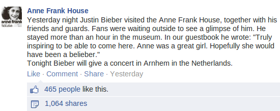 Child musician and professional Twitter trending topic, Justin Bieber has upset the world after a recent visit to the Anne Frank House. There were no reports that Bieber or his entourage behaved inappropriately during their hour long visit to the museum, but when the Anne Frank House Facebook page publicly posted what Bieber wrote in the guestbook the Internet went nuts. So what caused all the outrage?