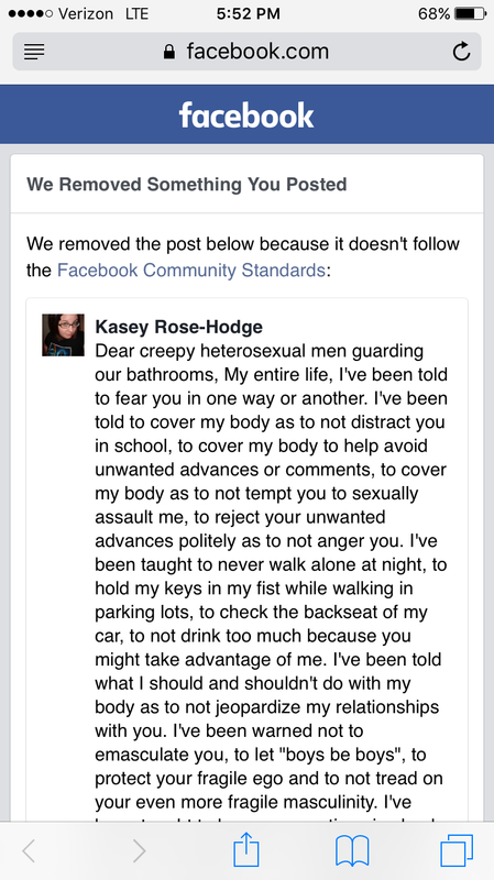 You may have seen an essay by Kasey Rose-Hodge floating around your internet-space lately. After watching everything that’s happening in North Carolina and other states, seeing the general anti-trans sentiment these bogus laws are stirring up, and seeing cisgender, heterosexual men take to going to places like Target, whose policy ensures that people can use the bathroom that matches their gender identity, to “guard the bathrooms,” this mother from Texas is basically asking a simple question: why do the bathroom needs of a small group transgender people spark this kind of “protectiveness” of women by men, when they don’t seem to be particularly interested in protecting women at any other time?