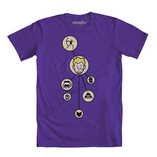 There are two Hawkeyes in the Marvel universe, and yes, they’re both called Hawkeye. There’s Kate Bishop, who smells like tea and flowers and pizza and maybe some socialite schmoozing, and there’s Clint Barton, who smells like coffee and dog food and costumes. I mean, it’s pretty clear who I’d want to go on a cross country road trip of emotional discovery with. Fortunately, I can now announce this with WeLoveFine’s Hawkeye shirts, now being offered in ladies sizes both scoopneck and regular. Part of the proceeds from each shirt goes to Futures Without Violence.