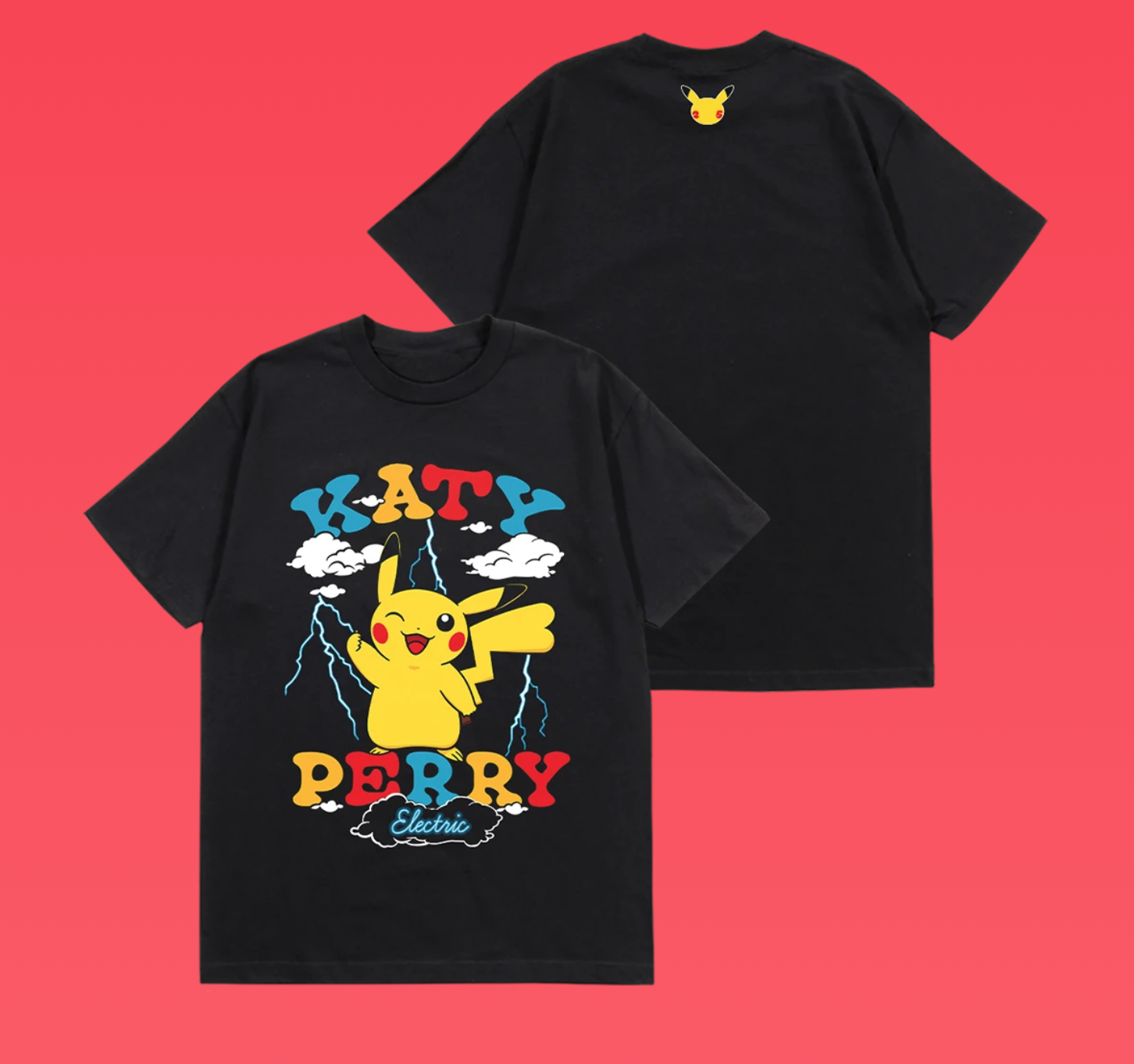 But wait, there’s more! To celebrate this collaboration (and because we need clothes to match our 25th-anniversary plushies) Pokémon and Katy Perry have joined together to create an exclusive line of wear that you can preorder now. There’s a shirt with Pikachu winking while being surrounded by lightning and the words “Katty Perry: Electric” on it. The shirts and hoodies almost the same except for the colors and locations of the logo.