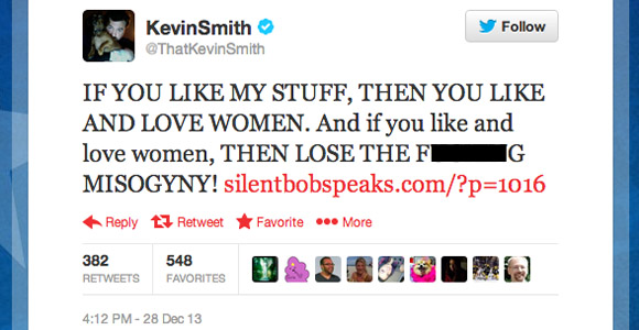 In case you missed it over the weekend, something really great happened. Writer/director Kevin Smith asked his fans to “lose the f*$#ing misogyny.” Unfortunately, something bad had to happen first.