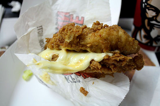 Incidentally, the staff at KFC will tolerate photography, visual inspections, and note-taking at their tables, but once you whip out the ruler, hoo boy. A cleaning man and the restaurant manager both came over to my table and asked me what I was doing with my pencils and cameras and implements of destruction. With a straight face, I told them simply, “I wanted to know how big the Double Down was. There’s nothing wrong with that, is there?” The manager didn’t seem too swayed by my argument, and I could sense his uncertainty of what to do. I guess the KFC training manuals don’t cover this sort of situation. I added, “I’m not bothering anybody, I’m just sitting here trying to enjoy my food. Just give me fifteen minutes, then I’ll be gone.”