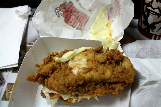 As far as the size of the Double Down, the one served to me measured slightly under 5.5 inches. (That’s 13 centimeters for the rest of the world, or for the target demographic of this product, 0.001273148 football fields.) I only measured one of these, so there may well be some sort of dimorphism prevalent in these things that I’m not aware of. I’ll leave that question to the world of academia.