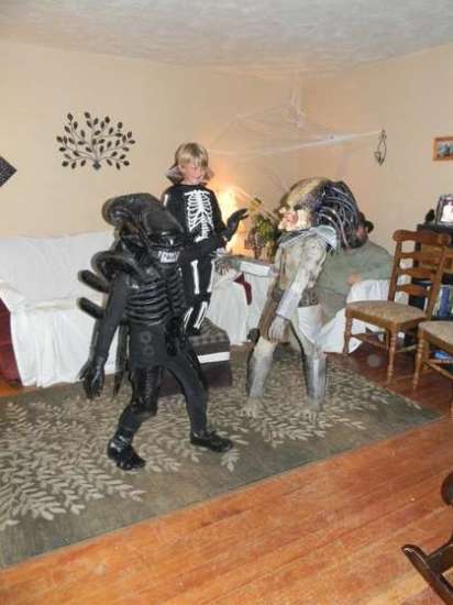 These mini-versions of Alien and Predator are as adorable as their big versions are creepy. The Instructables created the masks were rubber/latex but they said, “Most of this costume is made from cardboard, hot glue and cast off junk.” The best costumes are.