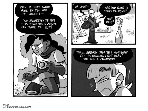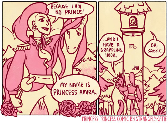 Princess Princess by tumblr user strangelykatie follows the adventures of Princess Amira (a heroic, adventure-loving princess who can generate her own shoujo flowers), Princess Sadie (a self-conscious sassmaster), and Prince Vladric (who hates being expected to fight monsters) as they take on high towers, low self-esteem, ogres, gender roles, and a seriously nasty evil sorceress. It should not be confused with the manga of the same name. This 44-page short-comic has amassed a fan-following on tumblr with the official Princess Princess Comic page filled with fanart as well as the occasional character art bonus from strangelykatie herself.