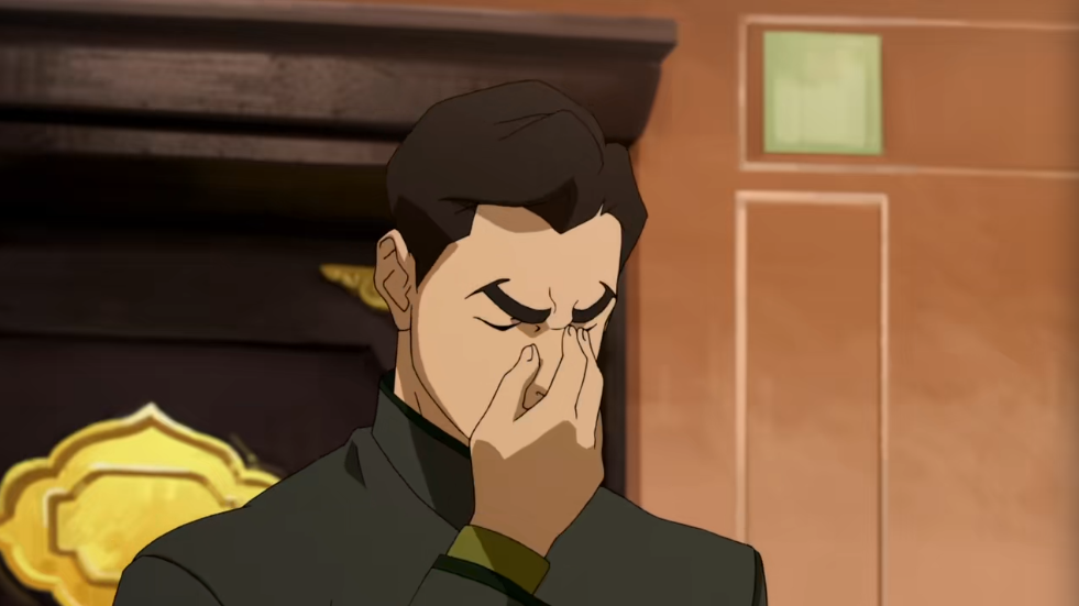 Kuvira shows up in Republic City with Bolin, Bataar Jr., Varrick and the rest of her merry brigade in tow. There’s a brief, semi-awkward reunion between Bolin and Eska that’s interrupted when a hotel employee informs Eska that, whoops, we booked you and your brother Desna in a room with one bed. She responds that that’s not a problem … because Desna sleeps in the tub.