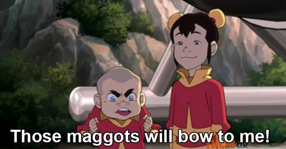 As the episode ends (holy crap, they packed a lot in this one!), we find Kai, doing his airbending robbing gig. No one seems to be on to him and he’s been living the highlife through the whole episode. The self satisfied jerk quickly finds himself in a world of trouble when two Dai Li agents grab him. Clue number three. Kai’s thrown into a cell with several other criminals – OH WAIT. Those aren’t criminals. OH WAIT. Those are airbenders?! OH CRAP, THE QUEEN IS BUILDING AN AIRBENDER ARMY?!