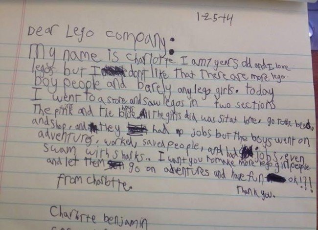 My name is Charlotte I am 7 years old and I love legos but I don’t like that there are more Lego boy people and barely any Lego girls. Today I went to a store and saw legos in two sections the girls pink and the boys blue. All the girls did was sit at home, go to the beach, and shop, and they had no jobs but the boys went on adventures, worked, saved people, and had jobs, even swam with sharks. I want you to make more Lego girl people and let them go on adventures and have fun ok!?!
