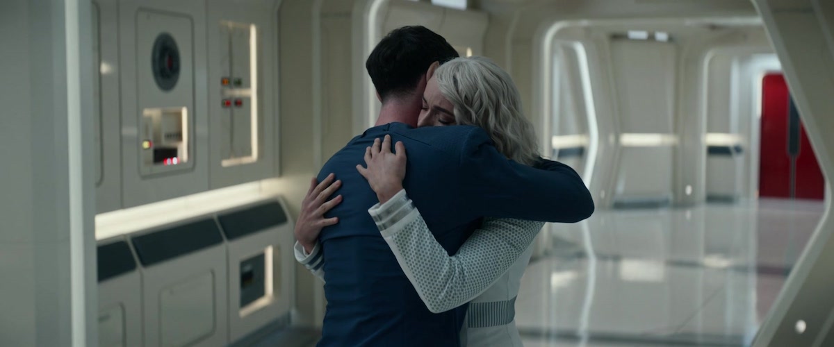 In the season 1 finale, “A Quality of Mercy,” Pike is faced with another double bind. When he tries to prevent the accident that will leave him with life-altering injuries in the future, his future self comes back to show him why he has to let events play out. The meat of this episode is great, with a tense space battle and James Kirk outsmarting the enemy as only he can, but for me, the best moment is when Pike realizes that no matter what he does, suffering will follow. His best course of action is to take on some of that suffering himself, so that he can prevent even greater tragedy.