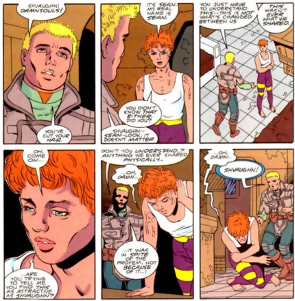 A few months later Legion of Super-Heroes #31 revisited Element Lad’s sexuality. Written by Mary and Tom Bierbaum, the story had Jan worry about his girlfriend Shvaughn’s increasing absences. Tracking her down, he discovers that Shvaughn Erin was born as a male named Sean Erin. For years Sean has been using a gender reassignment drug called ProFem. But with the economy now in dark times, she can’t afford as much of the drug and has been hiding whenever the effects wore off again. Element Lad, who knows a thing or two about changing physical matter, say that this doesn’t matter. He adds, “Anything we ever shared physically… it was in spite of the ProFem, not because of it!”