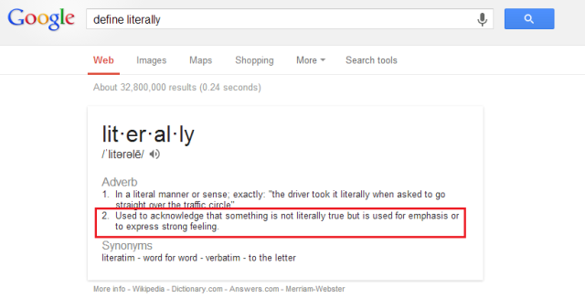 As one intrepid Imgur user figured out the other day, when you type “define literally” into Google, the definition includes a secondary meaning: “Used to acknowledge that something is not literally true but is used for emphasis or to express strong feelings.”
