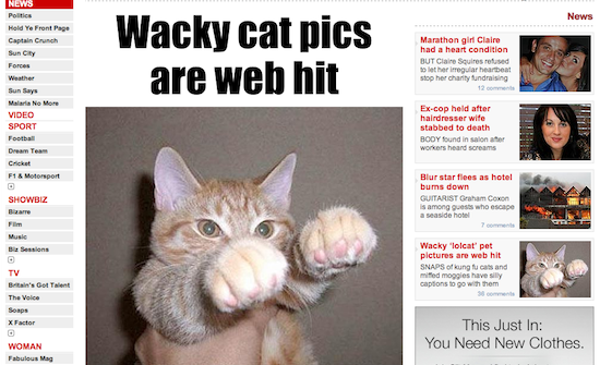 This article over on The Sun, entitled “Wacky cat pics are a web hit,” is an article from today, which happens to fall in the year 2012. The article only has a few sentences written up, followed by a handful of the mentioned “wacky cat pics.” As anyone who has an Internet connection knows, these “wacky cat pics” are LOLcats, and have been a cornerstone of the Internet for roughly ever. So, either we’re looking at a humorously out of date article, or we’re looking at one of the greatest trolls of all time.