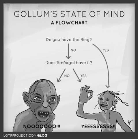 This obviously took a lot of work, but if you poke around LOTRproject.com a bit, you’ll see that’s nothing new for Johansson. The site has everything from a (nearly) complete Genealogy of Middle-Earth outlining the familial relationship of all the characters in the books, to this handy flowchart of Gollum’s state of mind in any given situation: