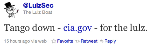 At 5:48 PM yesterday, hacker group Lulzsec claimed responsibility for taking down the CIA.gov website with a distributed denial of service attack. According to news outlets, the site was down or only intermittently accessibly until about 8:00 PM.