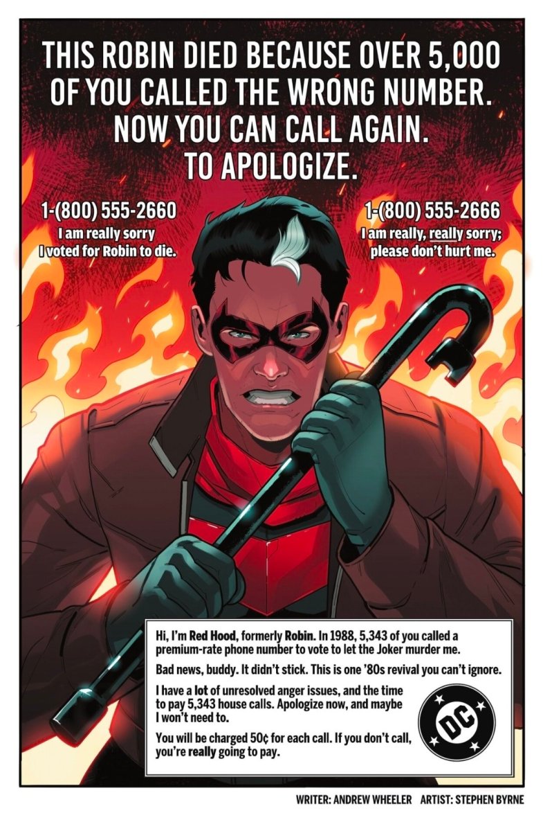 “Hi, I’m Red Hood, formerly Robin,” Jason writes in a lower text box. “In 1988, 5,343 of you called a premium-rate phone number to vote to let the Joker murder me. Bad news, buddy. It didn’t stick. This is one ’80s revival you can’t ignore. I have a lot of unresolved anger issues, and the time to pay 5,343 house calls. Apologize now, and maybe I won’t need to. You will be charged 50 cents for each call. If you don’t call, you’re really doing to pay.”