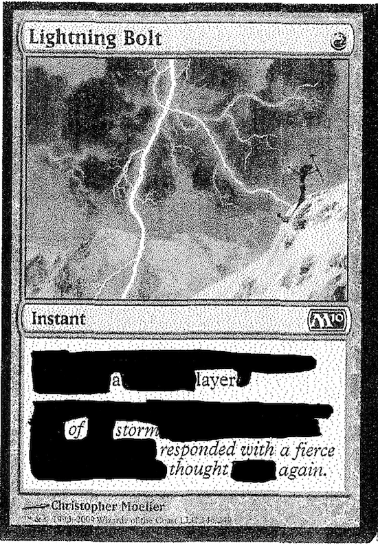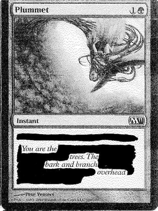 As part of a monthlong experiment in playing around with text, Adam Parrish, inspired by Austin Kleon‘s famous newspaper blackout poems, partially blacked out Magic: The Gathering cards to create mini-poems. In his own words: “Some of these turned out well, some not so well.”