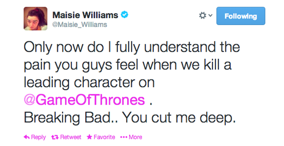 Game of Thrones actress Maisie Williams spends a good portion of her year playing Arya so she probably doesn’t have a great deal of time to sit down and binge a whole television season. So she just now got around to watching the Breaking Bad season finale and tweeted this message to her followers. Not that it’s in any way her fault for what happens to the characters we love on Game of Thrones but I still take a little evil satisfaction out of this.