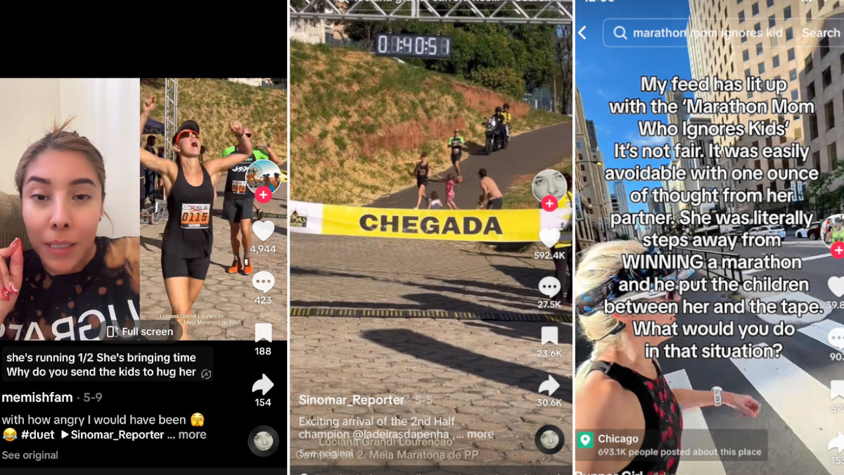 For some reason, the TikTok, first posted by Sinomar_Reporter, has been referred to as “Marathon Mom Ignores Kids.” However, a more fitting title is “Husband Nearly Costs Marathon Mom A Win.” The video sees a woman racing toward the finish line of a half-marathon. Every runner knows the few yards before a finish line is where racers put every last ounce of energy towards a final kick, so the woman is nearly in a full sprint with another runner close on her heels, about to finish with an incredible time of sub-1:41:00. Even the runner behind her begins clapping for her as she nears the tape. Then, suddenly, a man on the sidelines, presumed to be the woman’s husband, pushes two small children into the path of the sprinting racers, seemingly urging them to give her a hug right at that moment.