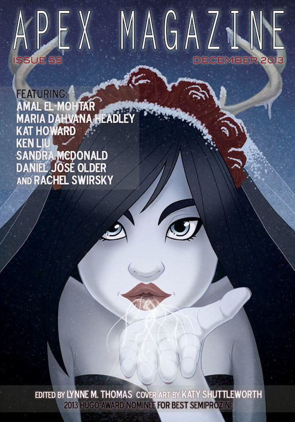 This story is from issue 55 (December, 2013). The issue also features fiction by Sandra McDonald (“Our Daughters”), Kat Howard (“Haruspicy and Other Amatory Divinations”), Ken Liu(“Before and After”), and Rachel Swirsky (“All That Fairy Tale Crap”), an interview with Maria Dahvana Headley, poetry by Amal El-Mohtar (“Turning the Leaves”), and nonfiction by Daniel José Older (“Another World Waits: Towards an Anti-Oppressive SFF”)