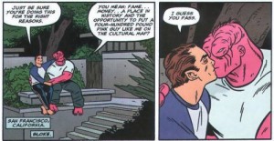 No, what really got me was when The Independent claimed that Mark Millar “wrote the first gay kiss between male superheroes,” and not just because this is easily disproved by about three minutes on Google (hence, the panels which accompany this article).