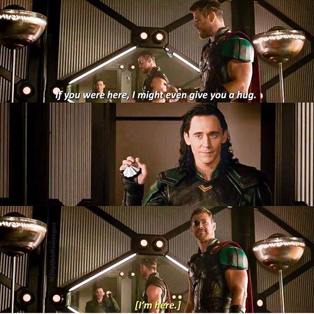They have a nice exchange where Thor says that maybe Loki isn’t all bad, Loki agrees, and then Thor, thinking that this Loki is another illusion and that the real Loki is long gone, says, “If you were here, I might even give you a hug.” He throws an object at Loki, expecting it to pass through him, but Loki catches it and says, “I’m here.” Thor smiles, but the scene changes—no hug.