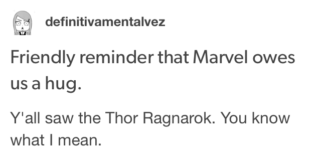 With so much at stake in Infinity War, this should be a movie primed for hugs and other exchanges of affection. I want to see Tony Stark embracing Rhodey Rhodes. I want to see Tony welcome Bruce Banner back to Earth with a snuggle for his science bro. I want to see Tony actually hug his mentee, Peter Parker, who is like 16 years old and is likely going to see a lot of bad things in this go-round. I want to see Steve Rogers hugging his other best friend, Sam Wilson—perhaps he thinks he’s saying goodbye forever. I want to see Steve hug Natasha and Wanda—because men can also hug their female friends without it being romantic. I want to see someone give Thor a damn hug since everyone he knows is probably dead now.