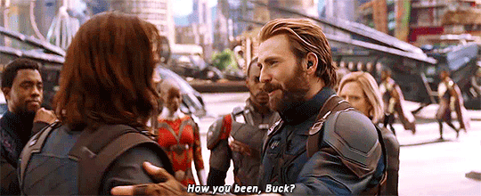 Steve [pats Bucky’s arm briefly]: How you been, Buck?