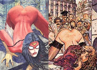 Anyone familiar with pornography knows this pose Spider-Woman Jessica Drew is positioned in is ripped straight from the fantasy medium. In fact, it’s almost identical to one Manara already drew in his Italian erotic comic book, Click!