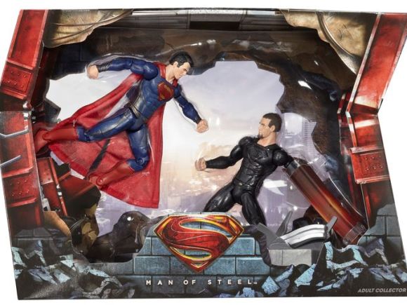 Below you can see Batman performing the Batusi, also inspired by the 1960’s television program, the Man of Steel versions of Superman and General Zod duke it out, Superman’s eyes glow red, and Hot Wheels offers a 1970’s style Battlestar Galactica Cylon Raider.