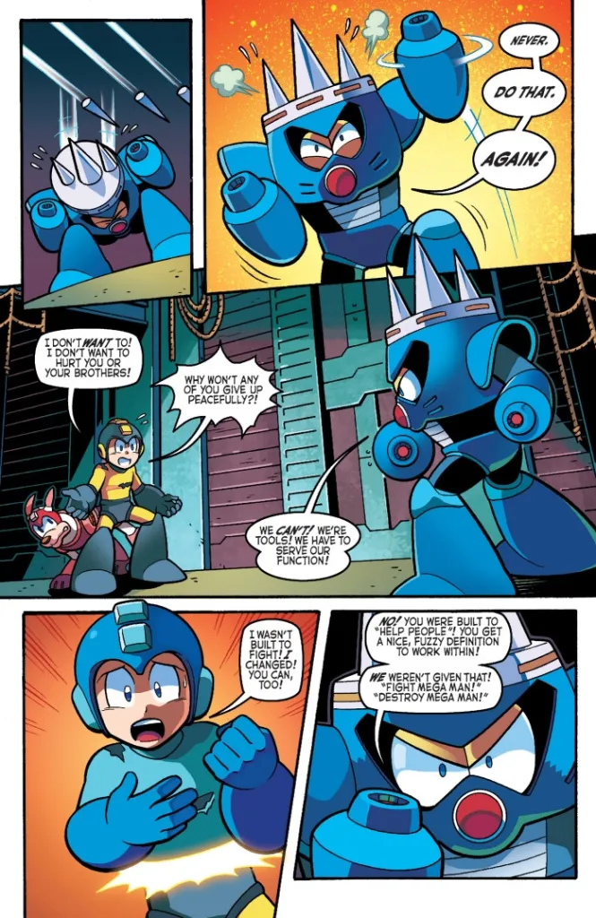 This might be the last thing one would expect when opening up a brightly coloured comic based on the digital hero of your childhood, but my god, what storytelling. Mega Man’s pleads for Needle Man to change, as Mega Man himself had – just as he changes the colours that denote his equipped weapon in the same panel. Needle Man’s resignation at his life’s narrow and predetermined purpose. Mega Man’s moment of hesitation and pity, before taking the shot. The way Needle Man looks helpless at the end, without any of his spiky accoutrements. And Rush’s crestfallen expression at the end? Whoa. What is happening to my 8-bit memories?