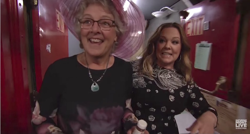 McCarthy pulled Joan out of the audience and guided her through the halls of Studio 8H, getting her hats and ketchup and foot cream. She introduced her to Alec Baldwin in his full Trump getup as well as Ryan Reynolds and Blake Lively (or, as McCarthy referred to them, “The Livelys”) for some reason. She took Joan down the corridor only hosts get to see, and sent her out on stage to introduce Haim and deliver the iconic “Stick around, we’ll be right back!”