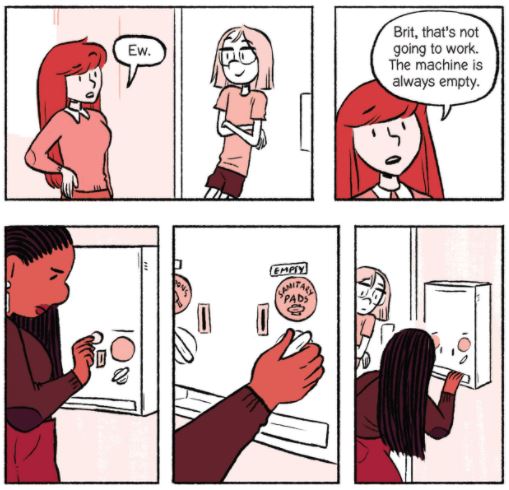 The rest of the book is about the girls speaking up about how periods shouldn’t be something to feel shame over and challenging the lack of access to the products in their school. Throughout the story, the book covers things like Toxic Shock Syndrome, cramps, standard menstruation products, period history, friendship, and how most organizations’ budgets overlook the needs of people with periods.