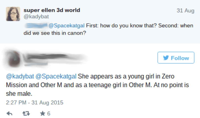 This is where we get into the uglier world of cisnormativity and transgender erasure. Over the years, Nintendo has slowly altered Samus’s design into a petite blond woman with large breasts. Finding her sexually attractive, some gamers are flat-out uncomfortable thinking about her as a transgender woman. As @ThatSabineGirl points out on Twitter, many gamers are incorrectly assuming she is cisgender simply from her gender presentation. The truth is, you can’t know if someone is transgender by simply looking at them. [UPDATE September 2nd, 11:40 ET: At their request, we have blocked out the name of one of the individuals involved in this discussion.]