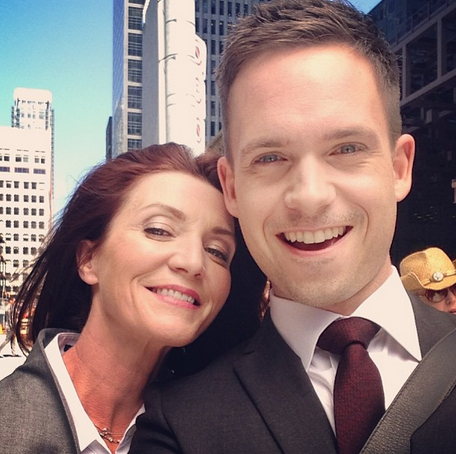 Here she is in a pic Instagrammed by her new co-star Patrick J. Adams. Wow. After Game of Thrones, I’m not used to seeing her smiling.