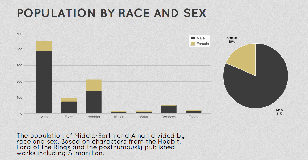 Emil Johansson of the LOTR Project has combed through Lord of the Rings, The Hobbit, The Silmarillion, and J.R.R. Tolkien‘s other Middle Earth-set works in order to chart the demographics—life expectancy, age distribution, and the like—of its denizens. It’s the gender breakdown that’s more up our alley, though. Only 19 percent of Tolkien’s named characters are female. No wonder Peter Jackson created Tauriel.