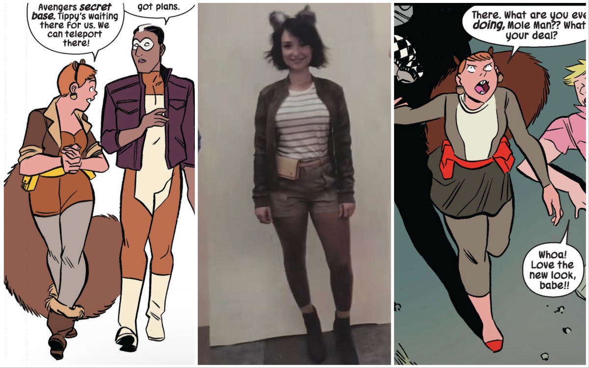 Left: Squirrel Girl runs, smiling, in a Marvel Comic. Right: Milana Vayntrub smiles on a red carpet.