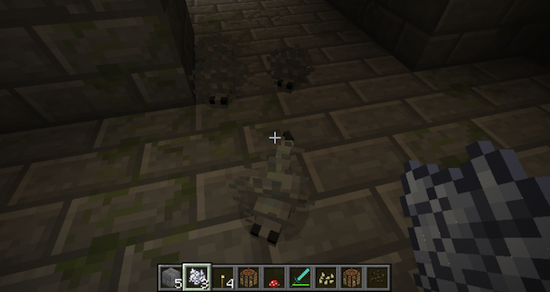 - Silverfish. Small bugs which can spawn other Silverfish when attacked, and spawn out of stone blocks, which make it possible for a large swarm of Silverfish to destroy a bunch of stone blocks: