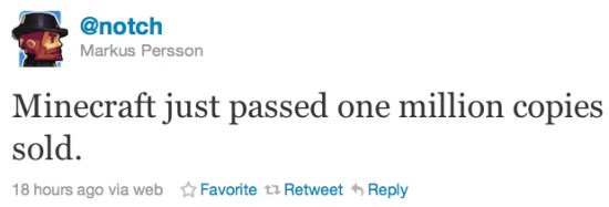 Continuing our breathless coverage of all things Minecraft, indie game developer Markus Persson announced yesterday that the game has topped one million sales. This is a major milestone for the game, which has become immensely popular and received a staggering amount of attention from the video game press.