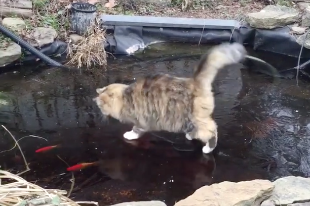 But we might be able to find a more peaceful metaphor in this poor little cat who just wants to play with their little fishy koi friends in the frozen pond.