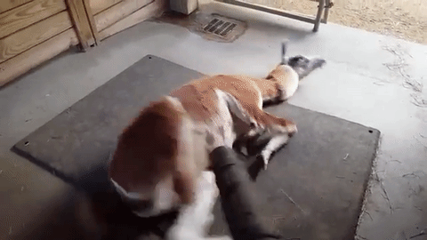 The Houston Zoo posted a video of their llama Fiesta delighting in the leaf blower that they use every morning to clean out debris from the stalls. Apparently, all is takes is a gust of air to turn Fiesta into a gigantic puppy—tail wags and all. And set to that delightful, happy music? I guess you could say Fiesta was having a fiesta. Ha.