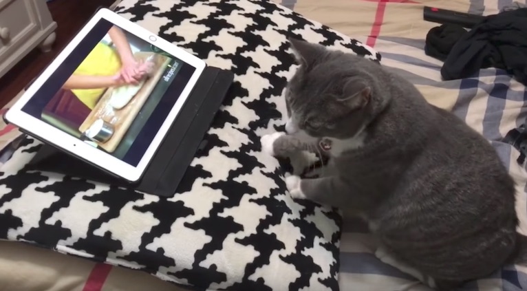 If you’ve ever had a cat or hung out with one, then you’d know that one sign that they may be comfortable with you is that they would “knead” on or around you. But the thing is that some kitties need a bit of training in proper kneading technique, so they do as we all do after watching hours and hours of Great British Bake-Off: watch video tutorials on YouTube. Enter this cutie-cat, who wants to improve their technique by kneading on this pillow while watching a nice video on the interwebs. D’aw, am I right?