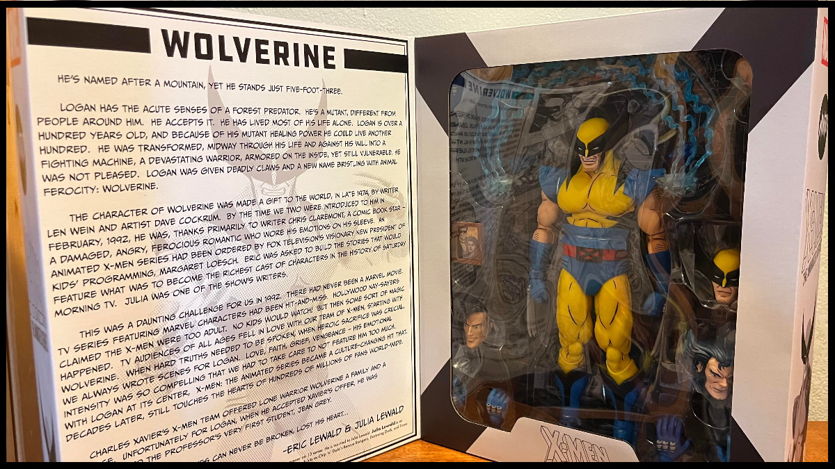 I’m usually not the type to keep a figure in the box, but the box, in this case, is so cool! The box is covered with never-before-seen storyboards from the animated series that include sketches and notes from specific scenes. What’s nice is that you can open the front of the box to show off Wolverine without hurting the packaging, so you can decide to leave Wolverine in the box or take him out and arrange him how you see fit.