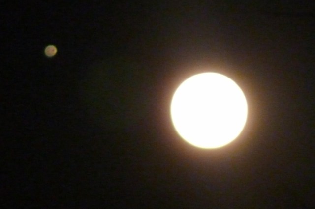 The best time to catch the duo is about 45 minutes after sunset. If you look about two-thirds up from the horizon, you should be able to see the moon at its first quarter, and Jupiter will be situated just up and to the left by about five degrees (just like in the above photo). Jupiter is going to be the brightest “star” in the sky tonight (after Venus and the moon, of course), so you won’t be able to miss it.
