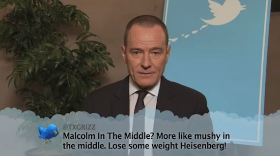 If there’s one thing we like more than saying mean things about people more successful than us — and we’re not saying there is, because that is, like, a top five pastime around these parts — it’s watching celebrities debase themselves by reading mean things that other people have said about them on Twitter. Of course, it’s not really celebrities debasing themselves, because the joke is really “Look how impotent the best attack you can muster on this person is! It is a joke that they will repeat themselves on national television, because who cares what you think @some_asshole_on_twitter?” Still and all, we do get a kick out of watching folks like Modern Family‘s Eric Stonestreet and Breaking Bad‘s Bryan Cranston reading people’s ill-conceived Internet slams on them in entertaining and only occasionally threatening fashion.