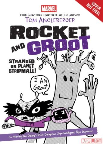 Rocket Raccoon and Groot will also be getting their own book! The Guardians of the Galaxy characters are going to appear in a novel by Tom Angleberger (whom you might be familiar with from the Origami Yoda series) called Rocket & Groot: Stranded on Planet Strip Mall. This cover art may not be final, but it’s pretty dang cute: